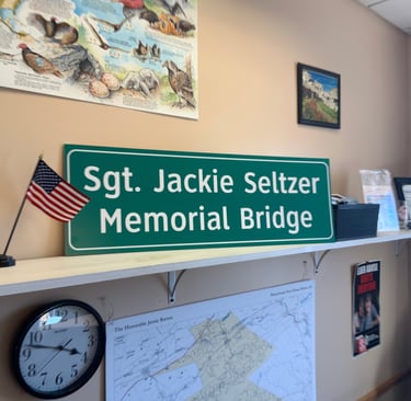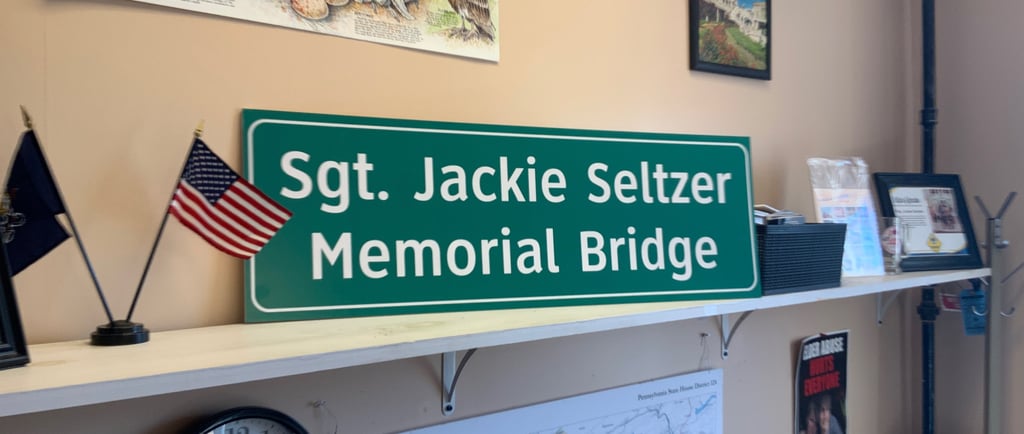 SGT Jackie Seltzer Memorial Bridge sign in Rep. Barton’s Hamburg office, prior to the bridge dedication.