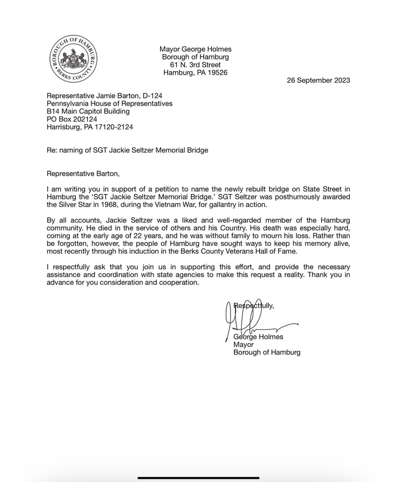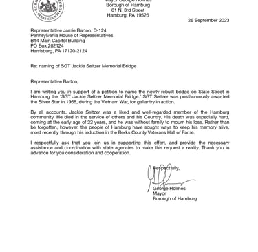 On May 12, 1968, while serving with Company B, 1st Battalion, 18th Infantry Regiment, 1st Infantry Division, 21-year-old Sergeant Jackie R Seltzer courageously charged a Viet Cong bunker and a large group of enemy that had his platoon pinned down. With his platoon leader wounded, Jackie took charge and led his men to defeat the larger force. As he was returning to evacuate the wounded, he was killed by small arms fire. At the time, Jackie only had 15 days left on his combat tour. He was awarded a posthumous Silver Star for his gallantry, and previously awarded a Bronze Star for Valor. This year, the newly built bridge on State Street was dedicated to his memory.