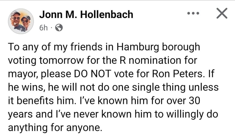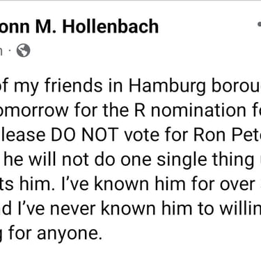 As expected, Ron Peters has decided to collect his write-in votes from the Democratic primary to run in November. Only he is not a Democrat, or maybe he is? After being fired from the Coroner’s Office, he ran as a Republican in 2021 for Coroner and lost. Later, when he visited the Coroner’s office and said to me that he would run again against John Fielding, I kicked him out of the office to avoid his disruptions. This is a personal vendetta for him; not any real desire to help Hamburg. After John Fielding told him he would not hire him in 2025, he then decided to run for Mayor.